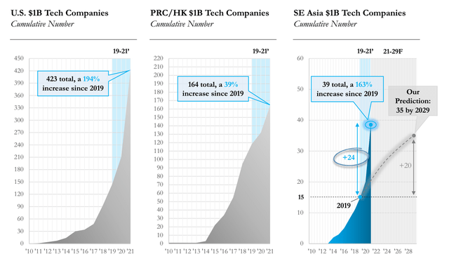 Only two years since the firm made the forecast in its first-ever Internet Report, that target has already been surpassed. Between 2019 and 2021, Southeast Asia added 24 billion-dollar tech firms and is now home to 39 of them.