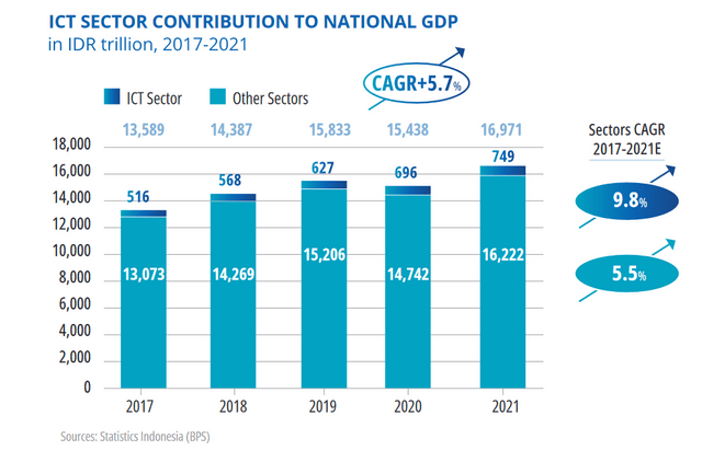 The ICT sector in Indonesia has proved to be incredibly resilient. Even in 2020, when the GDP experienced a pandemic-led contraction, ICT grew to IDR 696 trillion (roughly $48.6 billion). Since 2017 it has experienced steady year-on-year growth of 9.8% and is currently pegged at IDR 749 trillion (approximately $52.3 billion). It is expected to grow by 10.3% in 2022.