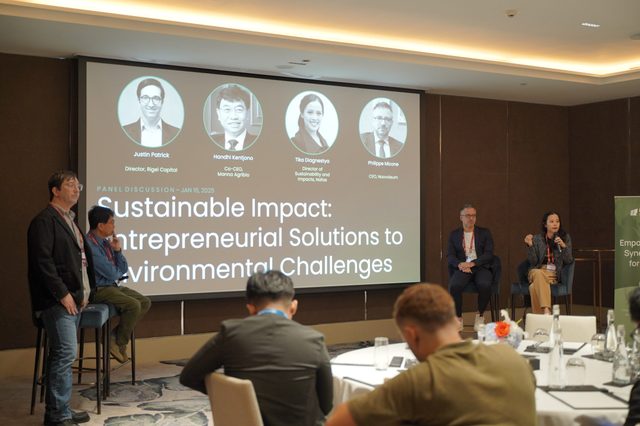 The session brought together representatives from three of the firm’s portfolio companies: Handhi Kentjono, co-CEO of Manna Agribio; Tika Diagnestya, Director of Sustainability and Impact at Nafas; and Phillipe Micone, CEO of Noovoleum.