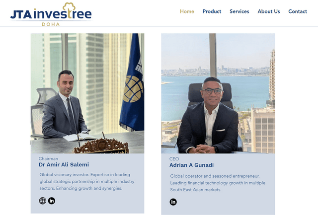 On JTA Investree Doha’s website, Gunadi is listed as CEO, alongside Amir Ali Salemi as chairman, who has held the CEO role at JTA International Investment since April 2010.
