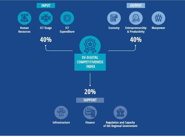 Between Input (human resources, information and communication usage and expenditure) and Output (economy, entrepreneurship and productivity and manpower), 80% of the weightage is split evenly. A final 20% weightage is assigned to Support which includes infrastructure, finance, regulation, and capacity of the regional government. The Support sub-index gets a lower weightage to ensure that direct inputs and outputs to the digital economy are given their due, over indirect factors.