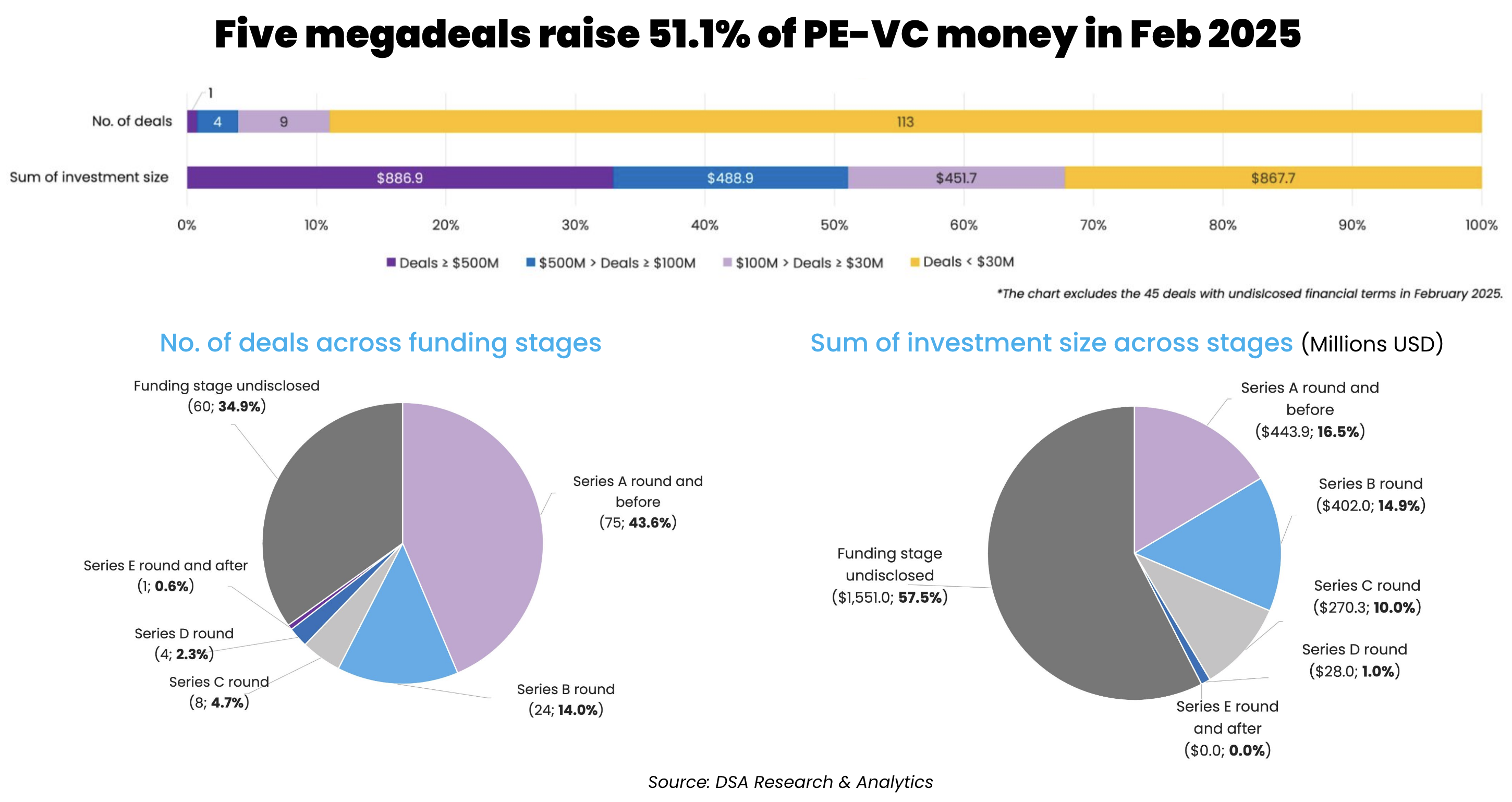 There were five megadeals (transactions worth at least $100 million) in February, which together amassed $1.4 billion, or 51.1% of the total proceeds in the month. However, no cheque size crossed the billion-dollar threshold. In comparison, there were seven megadeals in January