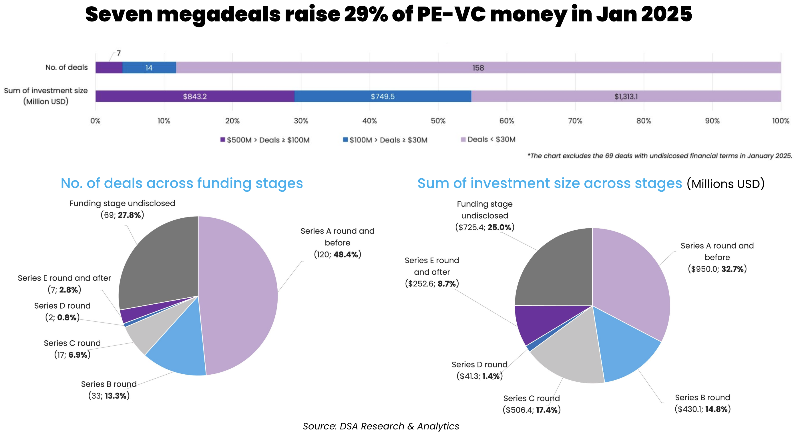 Early-stage investments dominated the country’s venture scene, accounting for 48.4% of the total deal count, despite contributing only $950 million, or 32.7% of the month’s total proceeds.