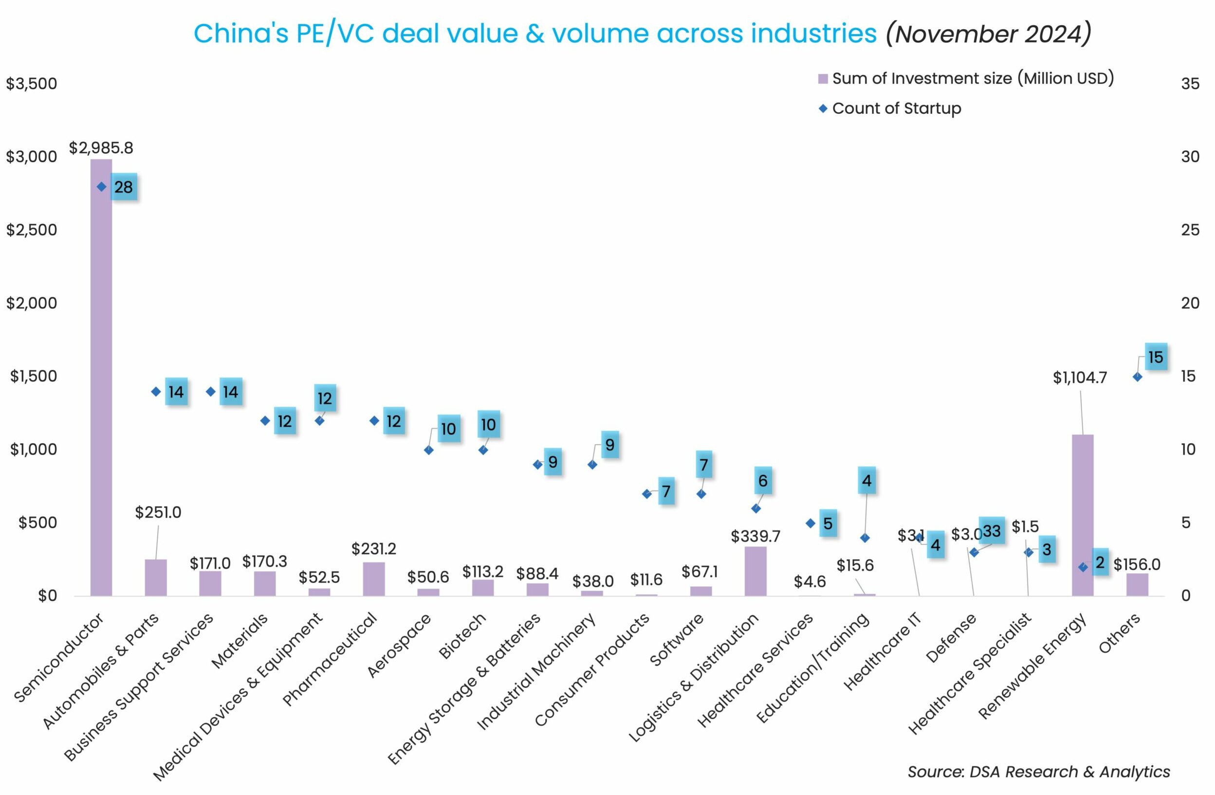 Overall, as the Greater China market counts down to 2025, the first 11 months of 2024 saw startups snap up $49.6 billion — up 5% over the same period last year. At 1,970, the deal volume was down by 15.8%.
