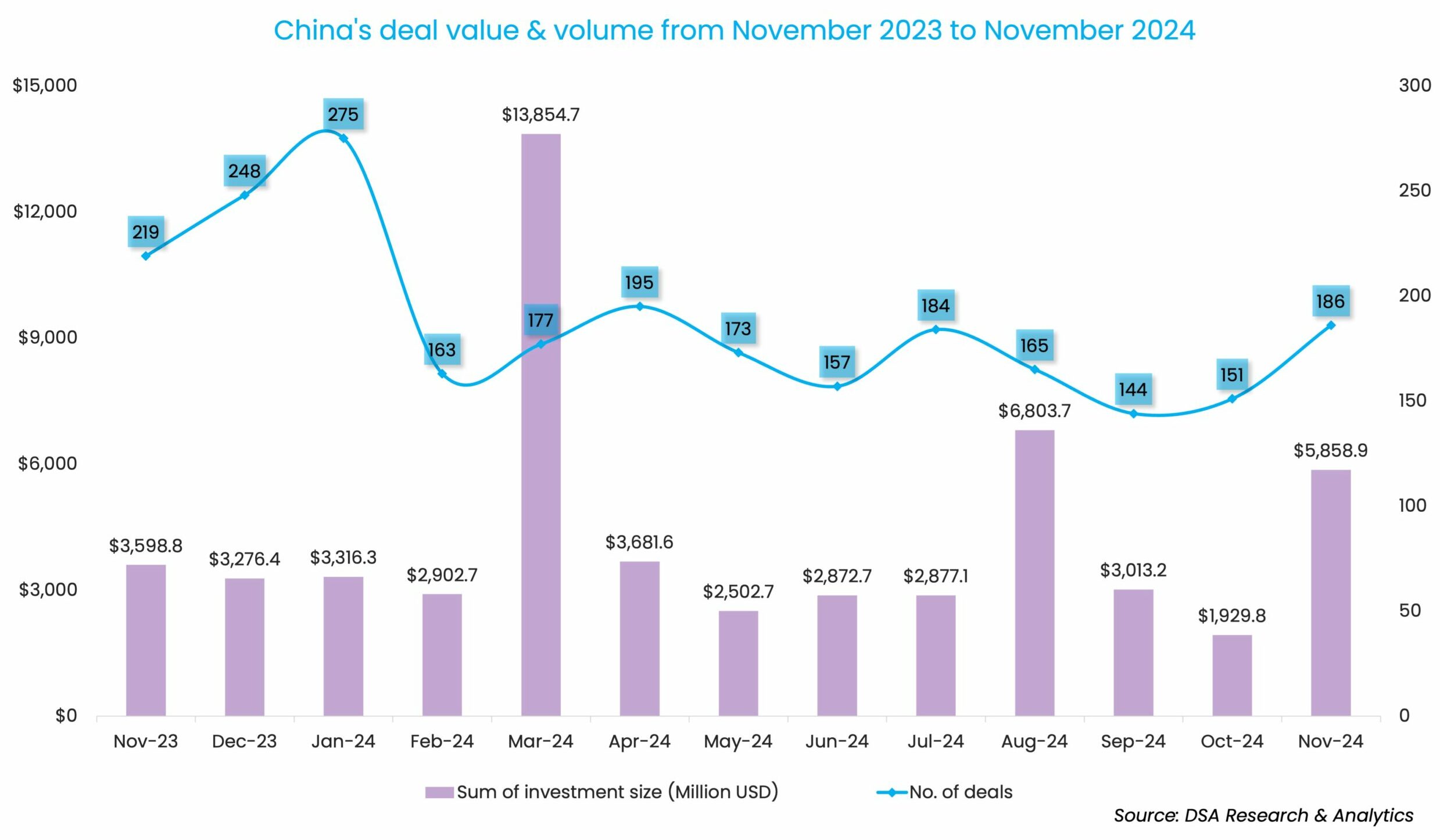 The deal value, too, tracked a significant upswing in November, as privately-owned firms in mainland China, Hong Kong, Macau, and Taiwan amassed around $5.9 billion, three times more than the $1.9 billion recorded in October.