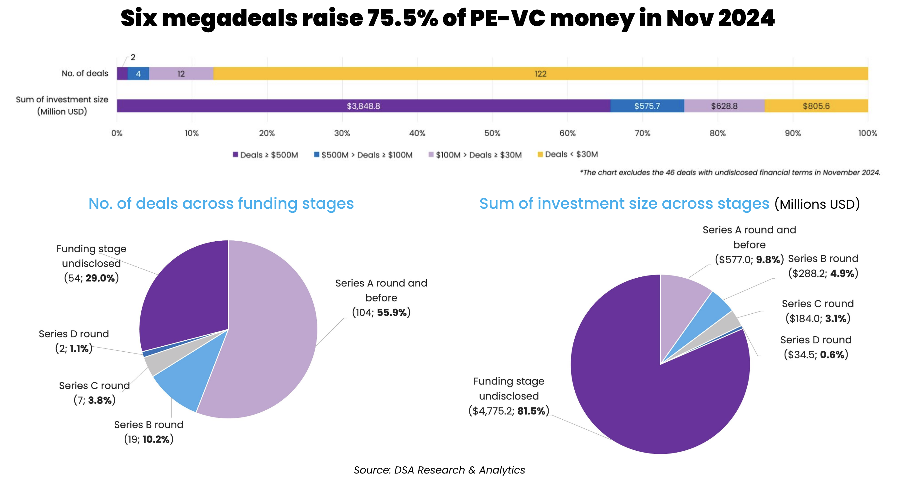 One major factor that drove up the monthly proceeds was the completion of six megadeals, or investments worth at least $100 million, which contributed to 75.5% of the total capital secured in November.
