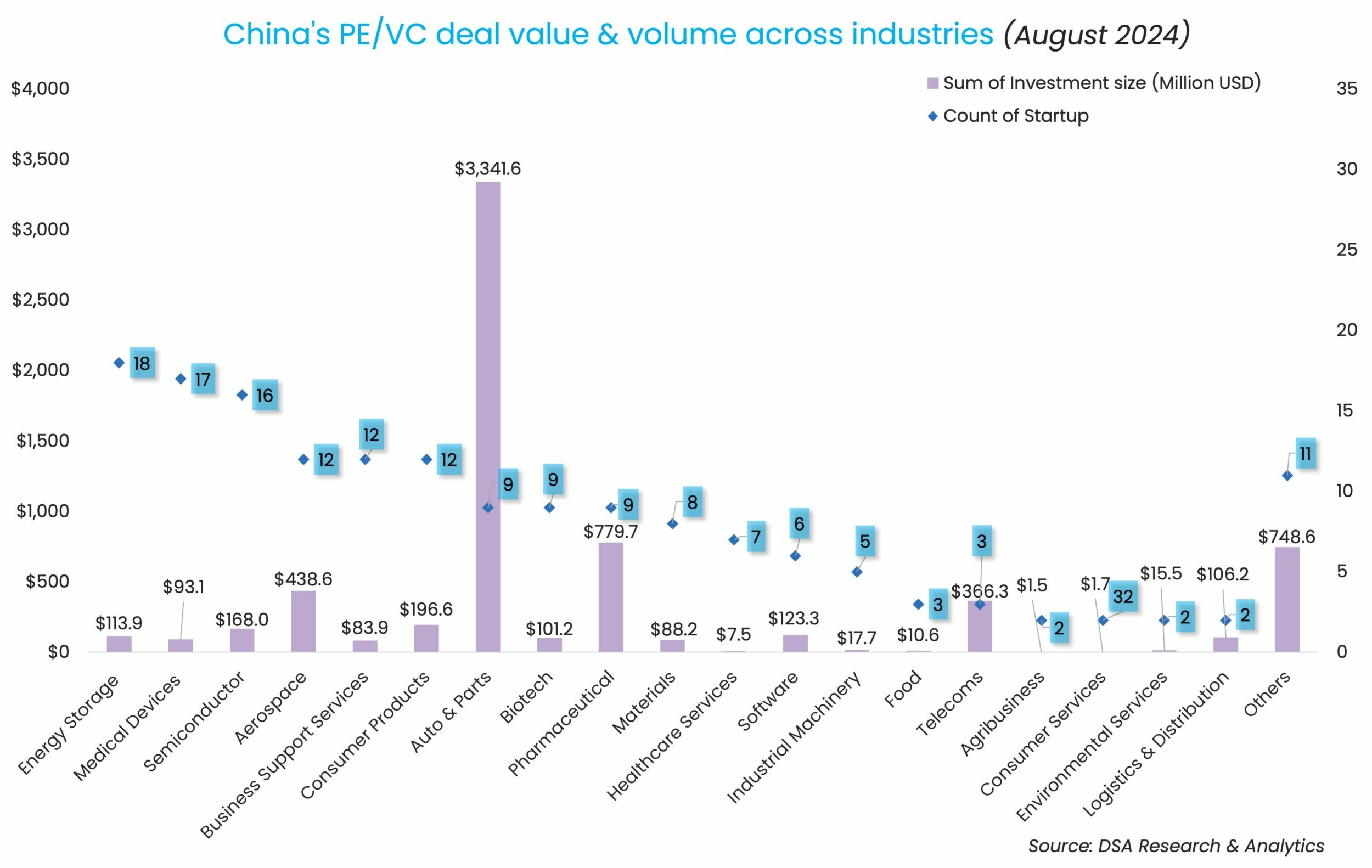 Overall, the first eight months of 2024 saw startups in Greater China secure $38.8 billion—up 11% from the same period last year, while the deal count of 1,489 is down 13.2%.