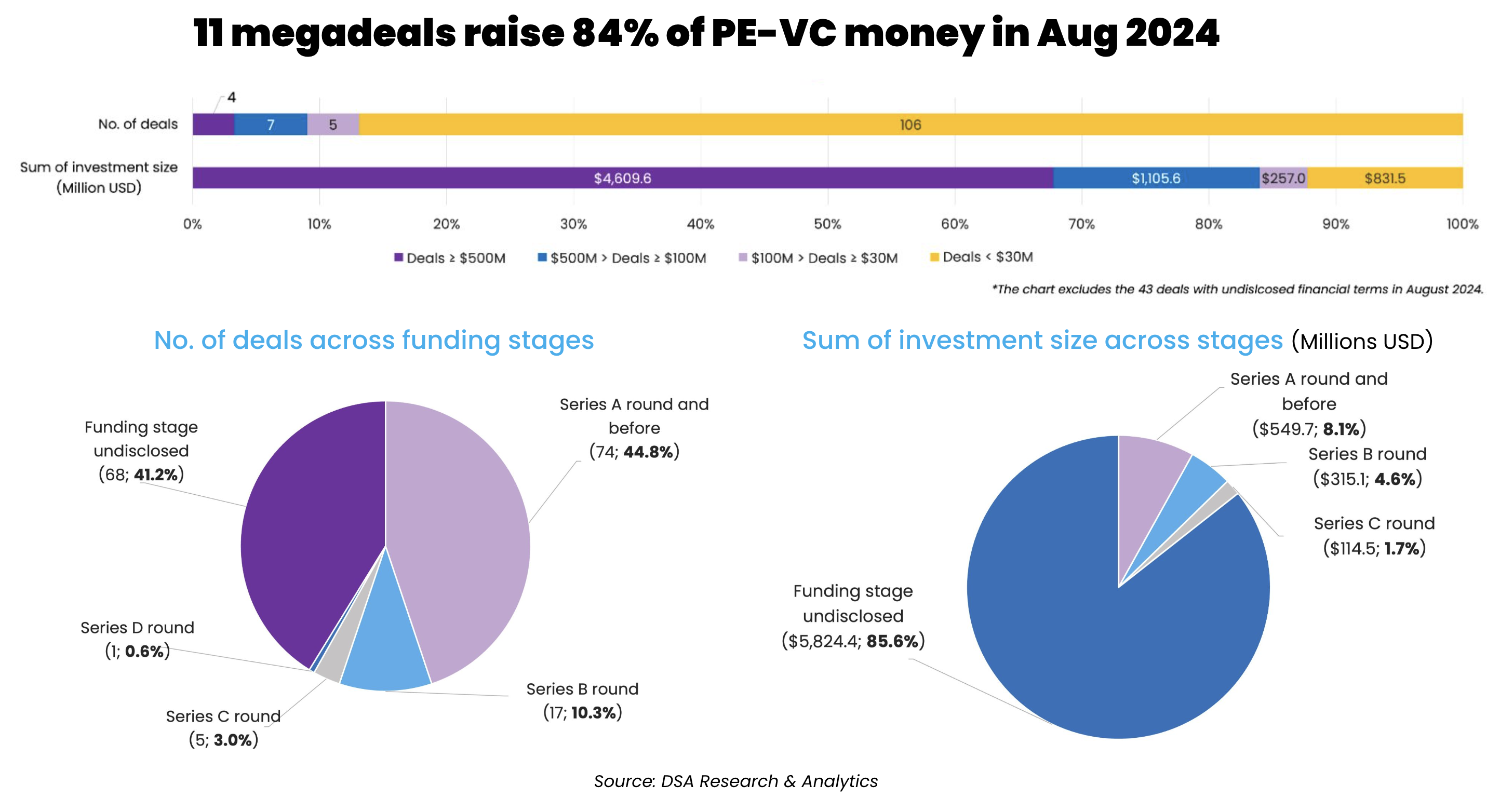 The surge in monthly fundraising was on account of 11 megadeals, or investments worth at least $100 million, which garnered 84% of the total capital raised in August. In comparison, there were six megadeals in July that accounted for 51% of the capital raised that month.