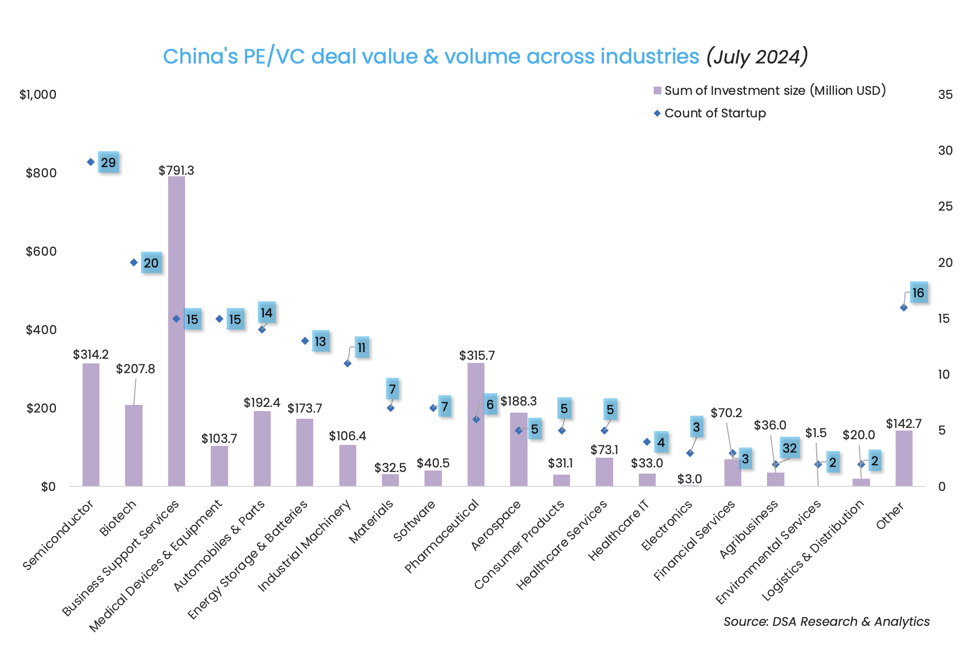 Besides the rare megadeal in the pharmaceutical sector, the month saw semiconductor and biotech take the lead in deal count, with the completion of 29 and 20 transactions respectively.