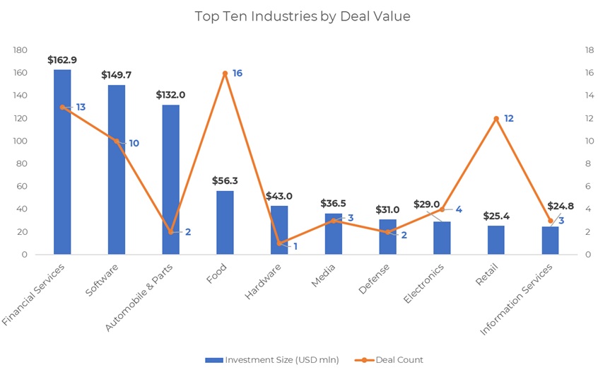 Together, the top three industries—financial services, software, and automobiles and parts—raised a total of $444.6 million, accounting for about 49% of the total deal value in the month.