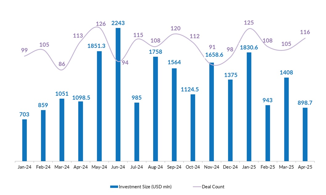 Private equity and venture capital investments in Indian startups plunged to a 14-month low at $898.7 million in April—a drop of 36% over March when startups had collectively raked in $1.4 billion. At 116, however, the deal volume increased 10% month on month, according to proprietary data compiled by DealStreetAsia.
