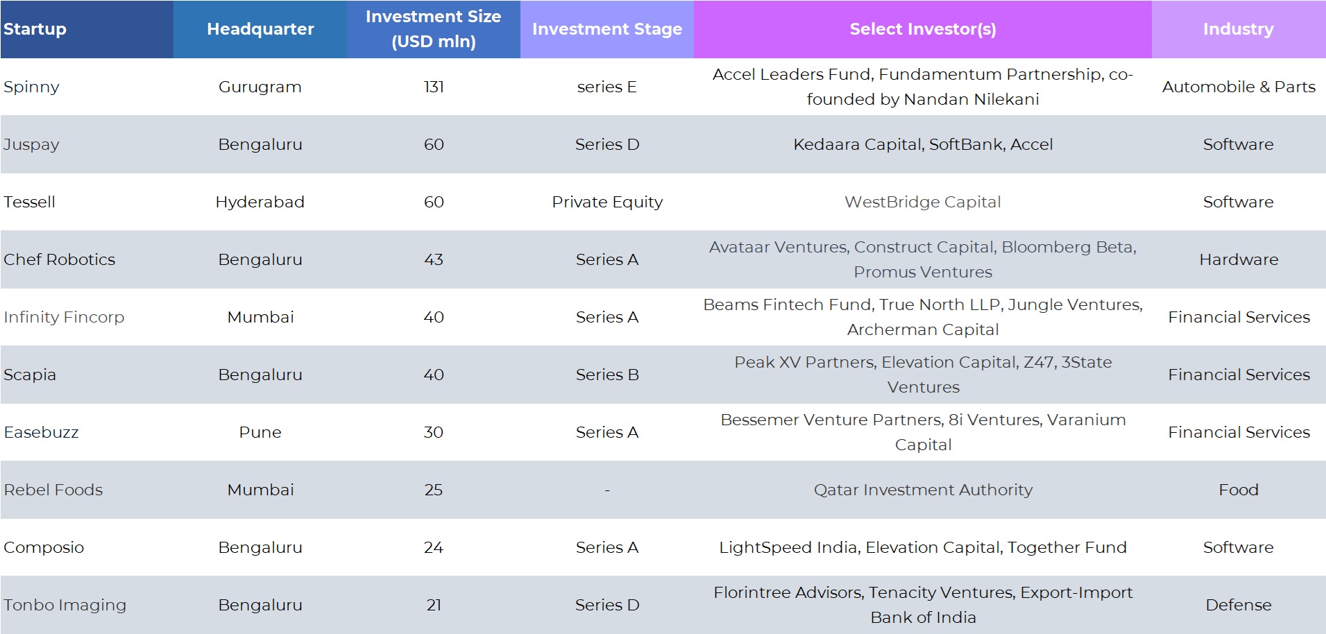 Startups that raised growth rounds in the month included Spinny ($131-million Series E), Pratilipi ($20-million Series E), BankBazaar ($6.5-million Series D2), Juspay ($60-million Series D), Tonbo Imaging ($21-million Series D), Uniqus Consultech ($20-million Series C), Scapia ($40-million Series B), Innovist ($16-million Series B), and Eloelo ($13.5-million Series B).