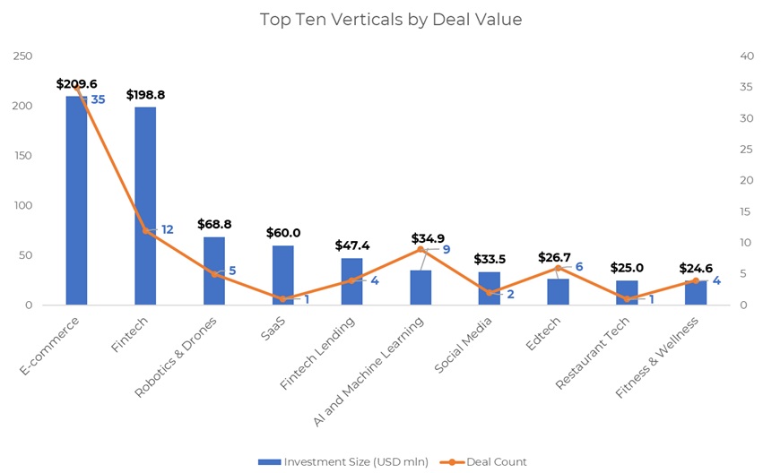 Financial services emerged as the most funded industry in the month with a total of $162.9 million in funding across 13 transactions. In comparison, startups in the sector raised $549 million from 18 transactions in the previous month.