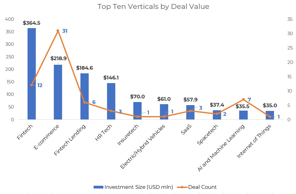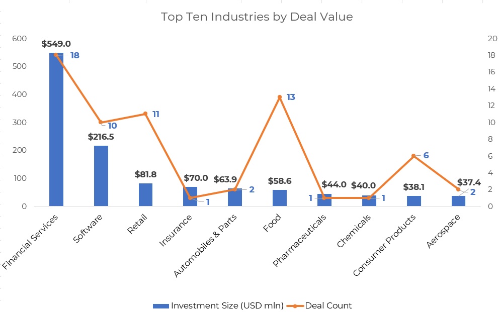 Financial services emerged as the most funded industry with total proceeds worth $549 million from 18 deals. Zolve led the pack, followed by Leap Finance, which raised a $100 million debt facility from HSBC’s ASEAN Growth Fund. Other prominent deals within financial services were sealed by Smallcase ($50 million), PayMate ($30 million), Incred Finance ($30 million), Nivara Home Finance ($28.2 million), and M1xchange ($18 million).