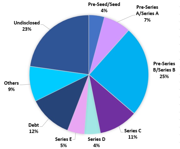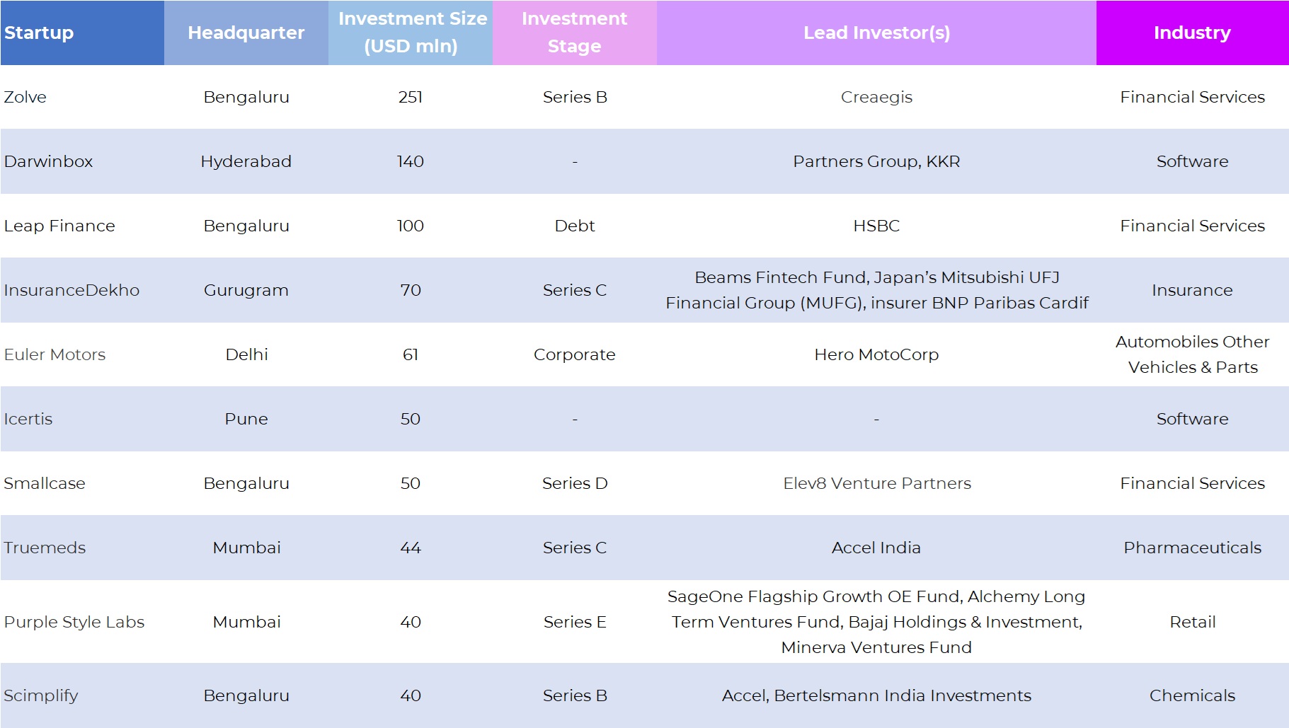 Startups that closed growth-stage deals in the month include Purple Style Labs ($40 million Series E), Country Delight ($25 million Series E), Smallcase ($50 million Series D), InsuranceDekho ($70 million Series C), Truemeds ($44 million Series C), Infinite Uptime ($35 million Series C), Zolve ($251 million Series B), and Scimplify ($40 million Series B).