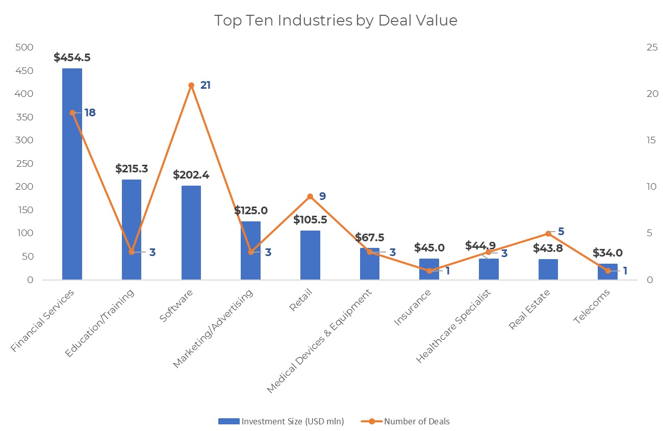 Together, the top three industries — financial services, education/training and software — scooped up a total of $872 million or 55% of the total deal value.