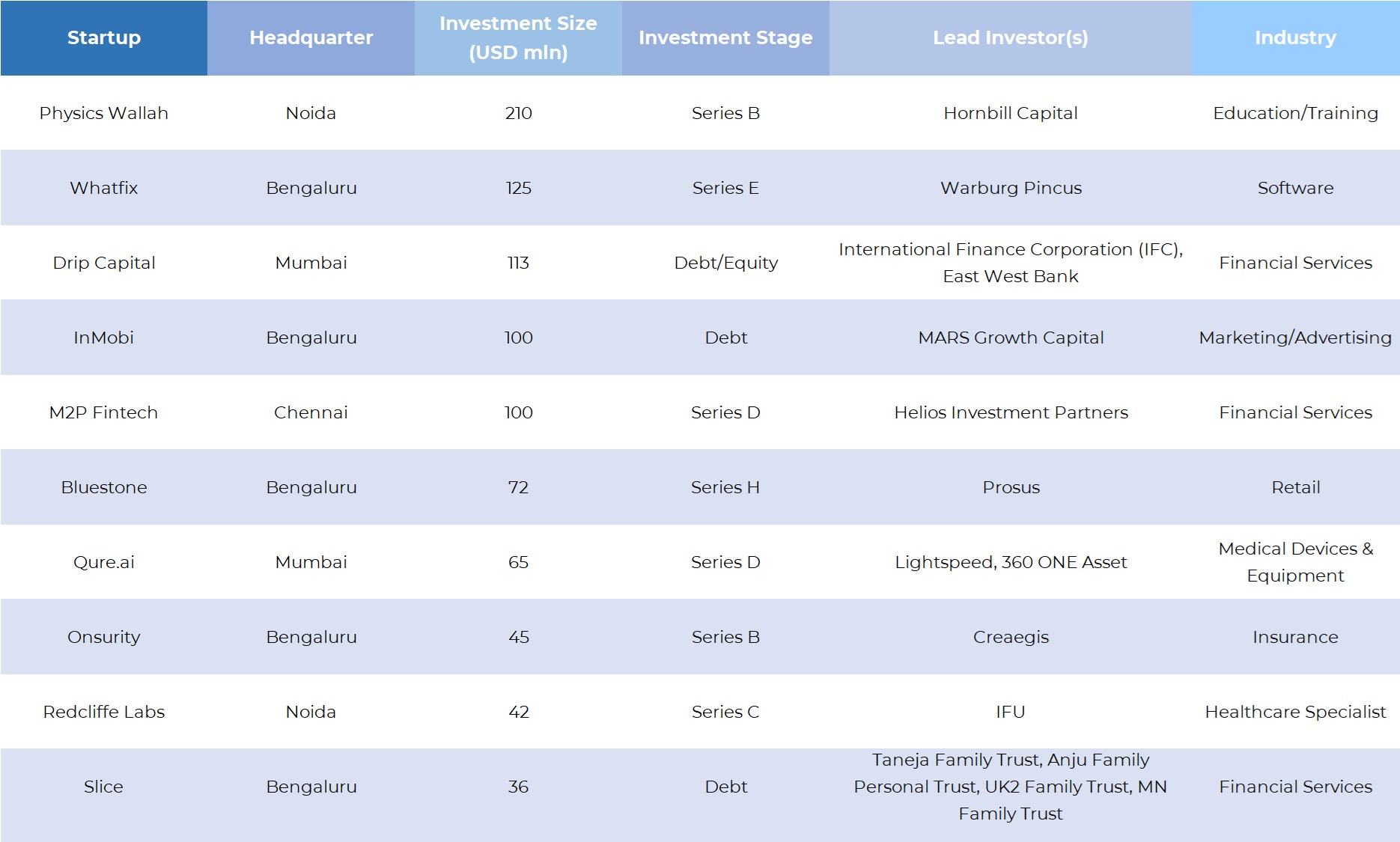 Startups that raised growth rounds in September included PhysicsWallah ($210-million Series B), Whatfix ($125-million Series E), M2P Fintech ($100-million Series D), Bluestone ($72-million Series H), Qure.ai ($65-million Series D), Onsurity ($45-million Series B), Redcliffe Labs ($42-million Series C), and FlexiLoans ($35-million Series C), among others.