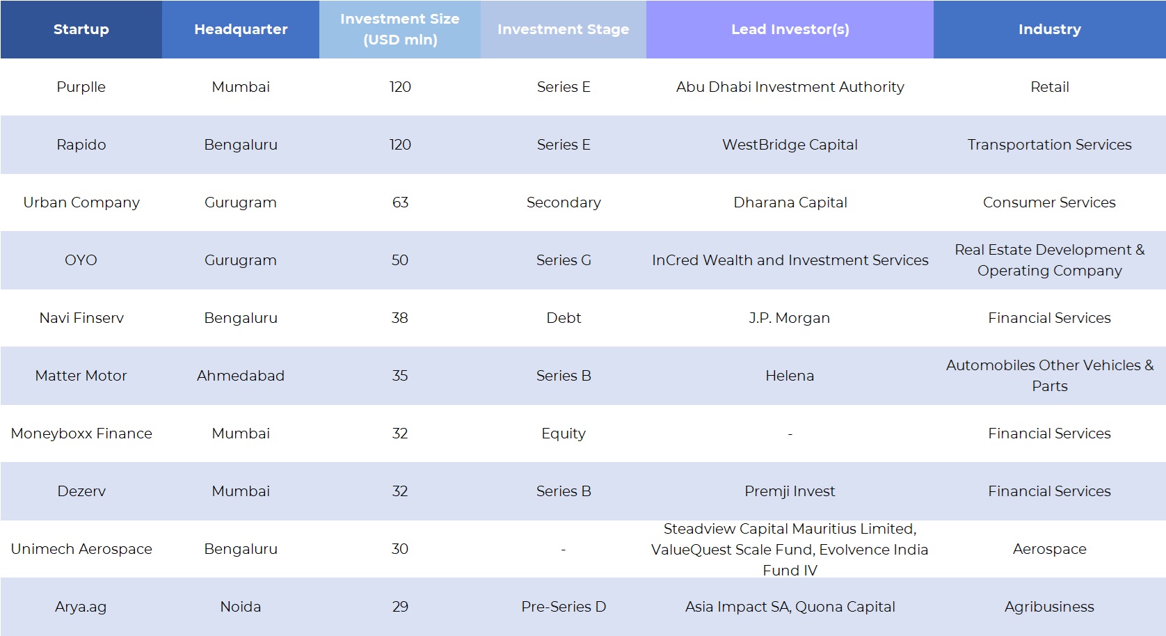 Budget hotel chain OYO, payments app BharatPe, ride-hailing platform Rapido, beauty platform Purplle, electric scooter maker Ather Energy, trade financing platform Vayana Network, gig platform Awign, EV bike maker Matter Motor, wealthtech platform Dezerv, drone startup Aereo, education services provider CollegeDekho, consumer lighting company Corvi LED were among the startups that raised growth rounds in July.