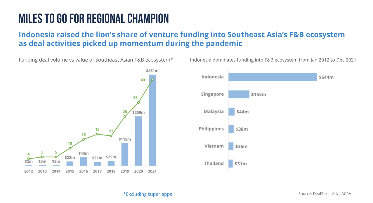 A notable trend is Indonesia’s absolute domination when it comes to investments in the F&B sector across Southeast Asia. It accounts for over two-thirds of equity funding raised in the region from January 2012 to December 2021, a little over four times the sum drawn by Singapore at the No. 2 spot.