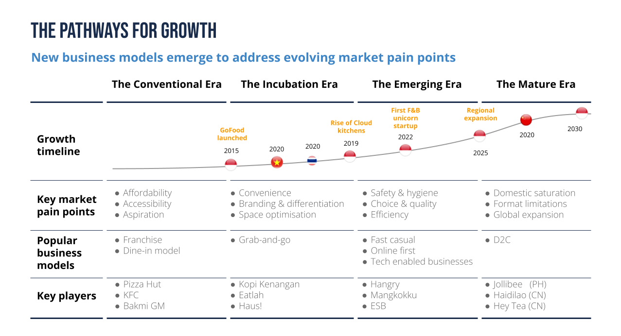 If the “conventional era” was dominated by marquee global QSR brands and a few homegrown heroes, the “incubation era” (2015-2020) saw an uptick in delivery which offered inexpensive options while meeting consumer demands for convenience. The “emerging era” (2020-2025) is defined by the industry’s response to the pandemic, and the proliferation of cloud kitchens who create their own brands. Local contenders have come to the fore, offering a contemporary take on traditional flavours and tastes.